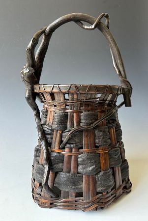 A Japanese hanakago (flower basket), featuring vertical bamboo supports interwoven with thick horizontal bands of sakura-gawa (cherry bark). The natural wood handle is left in its original, organic form, winding upward with irregular curves and visible knots—an intentional nod to shizen (naturalness) in Japanese aesthetics.