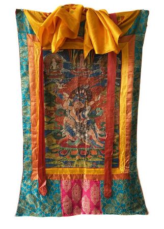 Tibetan antique thangka painting depicting the union of Hayagriva and his consort, Vajravarahi. Hayagriva, a wrathful emanation of Avalokiteshvara, is a popular deity and is especially revered by students. He represents protection against negative forces. His union with Vajravarahi, a wisdom dakini, symbolizes the power and energy that completes and balances Hayagriva's protective and compassionate qualities.