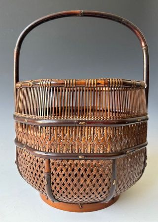 Its precise geometry and symmetrical structure demonstrate a high level of technical skill, while the arched handle—simple and graceful—balances the form with quiet elegance. The rich reddish-brown tones and subtle patina reflect the original finish.