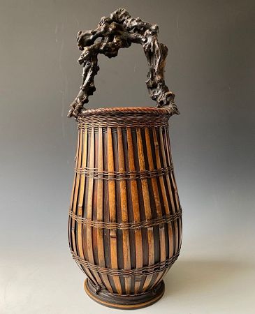 An antique Japanese Ikebana bamboo basket woven in an iconic barrel construction with a vase-like body and a free form gnarled Wisteria handle. Woven in slatted and finely sliced bamboo with a foot rim and a 16 point incorporated circular star woven at the base.