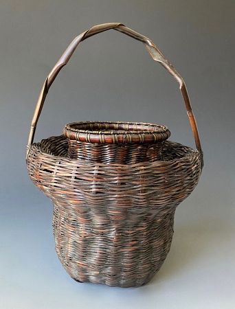 An antique Japanese ikebana (flower) basket by Yokota Hōsai (1899–1975). Made of thin split bamboo woven in a horizontal pattern. Unusual in form, the basket is made to look as if the shoulders are collapsing inward while the mouth remains upright - a whimsical visual effect giving it a pushed-in look. The handle is made of a thicker section of bamboo that has been twisted.