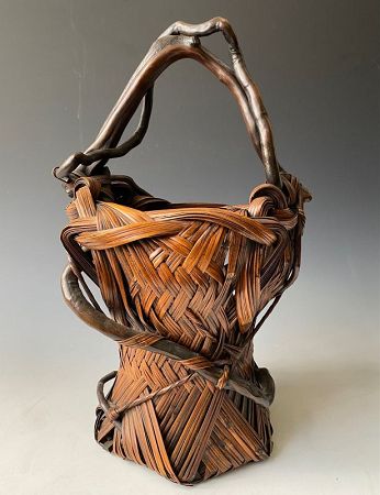 An antique Japanese bamboo Ikebana basket woven free form inspired by an organic Art Nouveau era. Smooth Wisteria branches incorporated in the handle and surrounding body structure. Six sided foot with hexagon woven support at the base. The body creates a woven geometric Kasuri (Ikat) pattern with multi-layered bamboo along the shoulder.