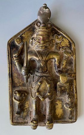 An antique Indian bronze votive planque depicting the Hindu god, Virabhadra. Considered the protector of Hinduism, Virabhadra is an incarnation of Shiva.