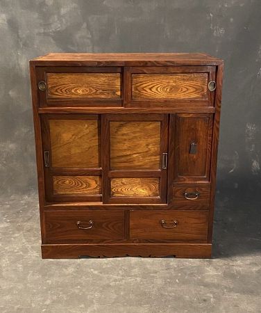 Japanese antique cha tansu (tea chest) made out of kuri or chestnut wood on the front and sides made out of sugi (Japanese cedar). The sliding panels are framed with Kuri wood and inset with Keyaki (elm wood). 2 compartments with sliding panals, 1 compartment with drop-in panel and 3 drawers. Beautiful joinery with all kiri interior.