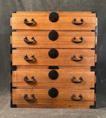 Japanese antique two section kasane isho tansu (chest on chest for clothing) made all of kiri (paulownia) wood. The top section has three large drawers and the bottom section has two drawers. Iron hardware includes round lock plates, warabite shaped drawer pulls, corner and edge brackets, and nice handles on the sides.