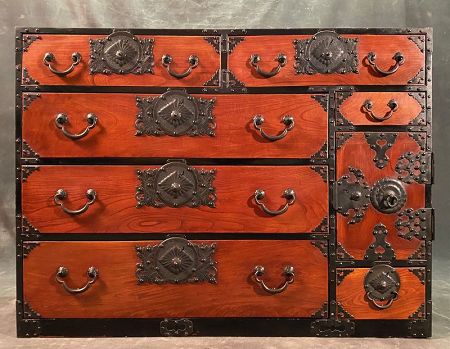 An antique Japanese Sendai Tansu kimono chest made of Keyaki (Zelkova) and Sugi (Cryptomeria) woods. All original Urushi lacquer finish and hand forged iron hardware. Side by side top drawers denotes the matriarch design. Three large drawers, two smaller drawers and a hinged security door that hides two drawers for valuables completes the storage.