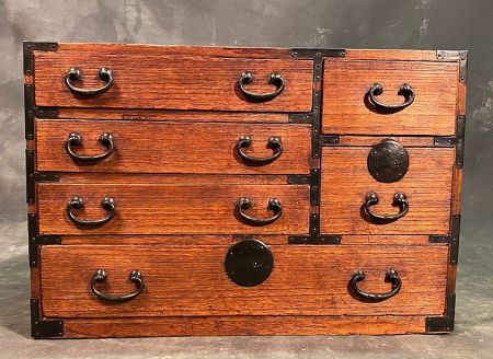 An antique Japanese Tansu chest known as a Kotansu made entirely of Kiri (Paulownia) wood. Originally used for personal storage, it would make a great accompaniment to a present day desk where drawer storage is needed. All original hand forged iron hardware. Unique Kanji identifying marks on the top add character and charm to the piece.