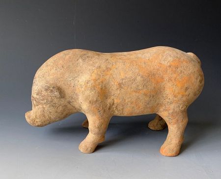 This example retains much of its original surface texture, with age-appropriate wear consistent with its two millennia of history. In Chinese culture, pigs are also associated with wealth, good fortune, and a comfortable life, often representing both material prosperity and a peaceful home. As such, this figure served not only as a guardian of sustenance for the afterlife but also as a powerful emblem of well-being and enduring prosperity.