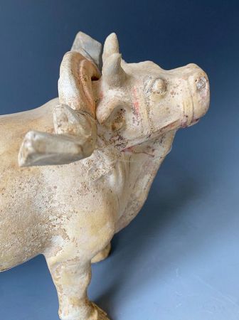 Figures of oxen were commonly placed in tombs as mingqi (“spirit goods”), reflecting the animal’s essential role in Han agriculture as a source of strength, endurance, and prosperity. In Chinese symbolism, the ox represented not only wealth and sustenance but also diligence and reliability, qualities prized in both life and the afterlife. As a funerary object, it would have served as a guarantor of abundance and stability for the tomb occupant.