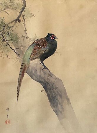 A Japanese antique scroll painting of a pheasant sitting on the branch of a pine tree. Painted in mineral colors and ink on silk with naturalistic details and special care taken in representing the feathers of the bird. Besides it's obvious grace and beauty, the pheasant is also a symbol of good fortune and prosperity.