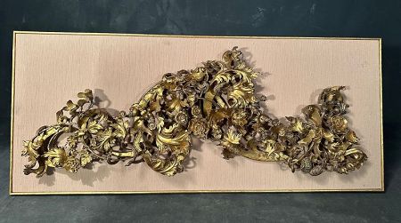 A well carved Indonesian gold gilt wood panel, dating to the late 19th century, now mounted and framed for display. hand carved in high relief with deeply undercut layers, the composition flows with scrolling foliage, peonies, chrysanthemums, and acanthus-like leaves, all richly gilded. The intricate craftsmanship reflects the tradition of Southern Indonesia carving workshops, often producing architectural and altar adornments for temples and grand homes.