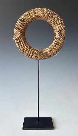 A hand woven antique Japanese rattan bowstring holder (tsuru-oke), crafted in a circular form with intricate basketry technique. This utilitarian yet elegant object was used to safely store spare bowstrings (tsuru) for the yumi, the long asymmetric bow central to Japanese archery. By keeping strings coiled, dry, and protected from tangling, the tsuru-oke ensured a warrior or archer was always prepared in training, hunting, or battle.