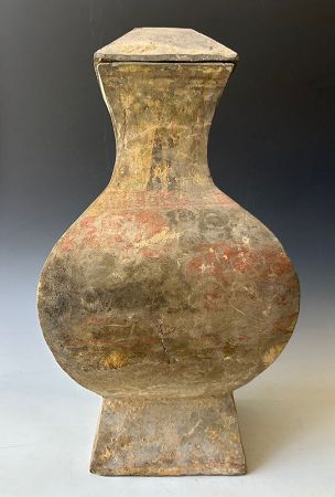 Chinese pottery hu vessel, dating to the Han Dynasty (206 BCE – 220 CE). The vessel is of flattened pear shape with a tall neck, flaring square mouth, and raised square base. Traces of original painted decoration remain visible in red and black pigments, including swirling cloud-like motifs and possibly stylized dragons or floral scrolls.
