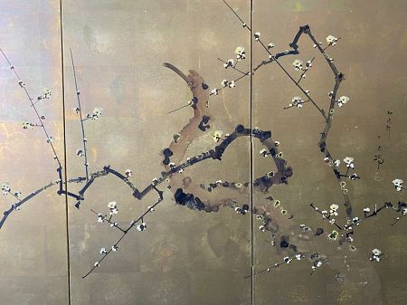 Japanese vintage byobu screen painting of a blossoming plum branch. Painted in mineral colors on metal leaf on paper. The screen consists of four panels. Symbolic of resilience, renewal and the coming of Spring. Signed by the artist.