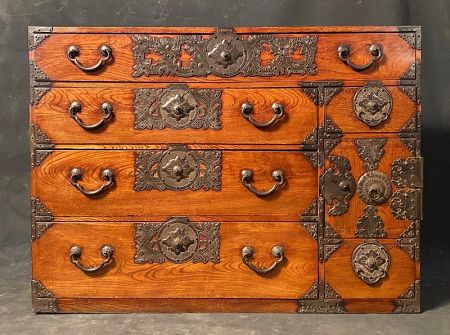 An antique Japanese isho tansu made of keyaki (elm) wood with beautiful grain, lacquer finish and original patina. There are six drawers of various sizes: One large full-width drawer at the top, three medium sized drawers and two small exterior drawers. A safe box on the right hand side has a hinged door that opens to three small interior drawers. Dramatic iron hardware includes elaborate lock plates with scrolling peony vines and moko shaped drawers pulls.