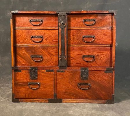 This well-preserved example is complete, with honest wear consistent with age, and remains a striking testament to the artistry and pragmatism of Meiji-era cabinetry. Its size, craftsmanship, and beautiful natural grain make it a highly desirable piece for collectors and interiors alike.