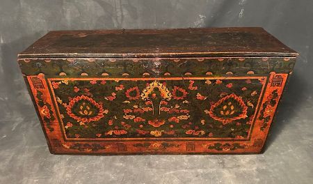Trunks such as this were essential furnishings in Tibetan households and monasteries, serving both practical storage purposes and as a focal point for decorative and symbolic display. The lotus, central to the design, represents purity and spiritual awakening, while the surrounding auspicious motifs convey blessings of prosperity, protection, and harmony.