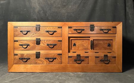 The chest features multiple drawers of varying sizes, fitted with forged iron pulls and lock plates, as well as a central sliding-door compartment concealing additional storage. The asymmetrical arrangement of drawers and doors reflects the Japanese aesthetic balance of function and design, allowing for both practical organization and visual appeal. Dimensions: 74" Long x 33" High x 20" Deep