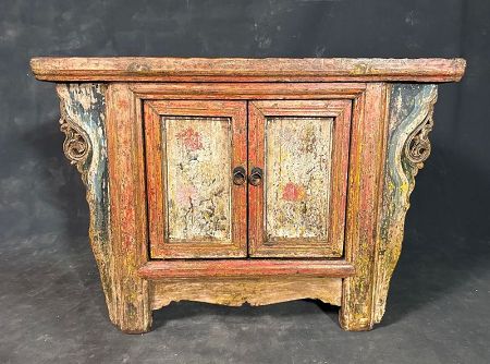Antique Chiense altar cabinet, dating to the early 19th century, retaining much of its original polychrome surface. The façade features two paneled doors framed by deeply carved and shaped side brackets, with remnants of floral and auspicious motifs rendered in red, yellow, green, and blue mineral pigments. These painted designs—now softened and aged to perfection—symbolize renewal, prosperity, and spiritual growth, all central tenets of Tibetan Buddhist art.