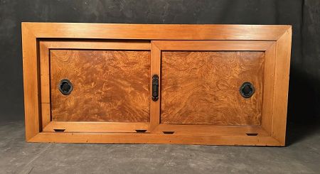Antique Japanese single section low tansu, constructed with hinoki (Japanese cypress) frame and striking keyaki (zelkova) burl wood panels. The warm, honey-toned hinoki provides a refined architectural frame for the highly figured keyaki, whose swirling burl grain creates a mesmerizing organic pattern—hallmarks of Japan’s finest cabinetmaking tradition.