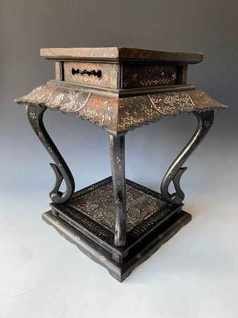 Such lacquer stands were often used in temple or aristocratic contexts, serving as supports for writing boxes, incense burners, or other ritual objects. The combination of complex inlay, sculptural form, and preserved patina reflects both the aesthetic and spiritual sensibility of early Edo Japan.