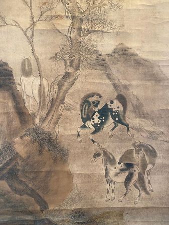 Chinese antique scroll painting signed by artist Zhang Mu, (1607-1683). The scene is of a group of horses under a tall, moss-draped tree. A small stream flows down the hillside and birds fly in the sky. The horses are especially beautiful - a dappled one prances in the grass. Title of Calligraphy on the upper right side of the painting is titled "Old Tree and Horses".