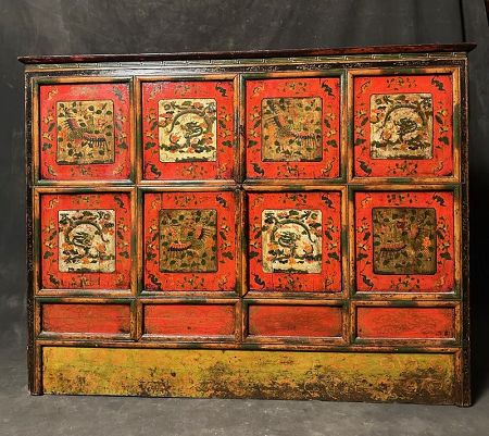 Cabinets of this form were traditionally used to store ritual objects, monastic textiles, or scriptures, and would have been found in Himalayan temples or noble households. The strong visual presence, bold color palette, and symbolic depth make this an exceptional example of Tibetan painted furniture.