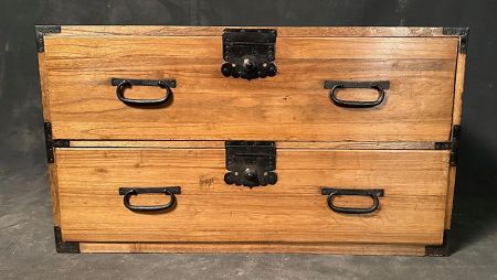 A clean and classic antique Meiji period Japanese kiri tansu chest featuring two full-width drawers crafted from solid paulownia (kiri) wood, prized in Japan for its light weight, dimensional stability, and natural resistance to insects and moisture. This chest showcases the warm, straight grain of kiri with a soft natural tone and subtle age character throughout.