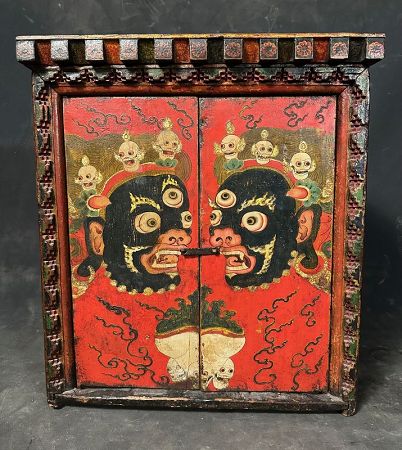 Above the protectors are rows of flaming skulls, representing the transcendence of ego, the impermanence of existence, and the burning away of obstacles on the spiritual path. Scrolling smoke and cloud forms further enhance the dynamic movement and protective energy of the composition. The cabinet’s carved and painted crown molding and frame retain layers of original polychrome with beautiful, age-earned patina.