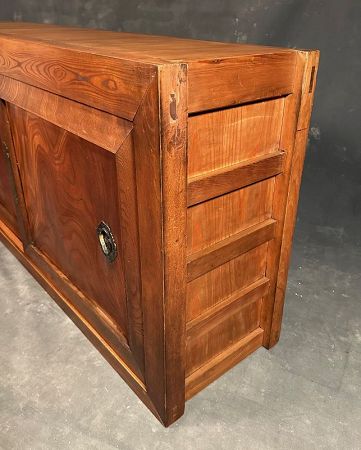 Antique Japanese solid keyaki (zelkova Elm) wood sliding-door chest featuring striking quarter-sawn panels that display the dramatic swirling grain patterns—known in Japan as tamo-mokume or keyaki-itame—highly prized for their depth and movement. The chest wide front panels showcase the natural rich color variation that occur when keyaki is cut on the quarter, revealing its iconic “flowing water” pattern.