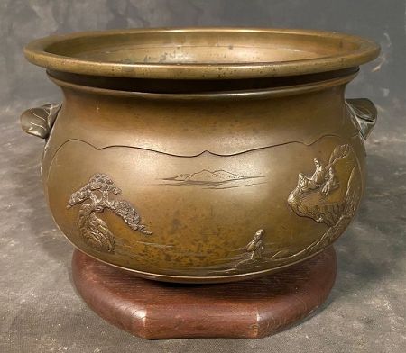 An antique Japanese bronze Hibachi depicting landscapes, wise men, sage women and flowers in relief. Unusual carrying handles with overlapping leaf design. Mounted on a hardwood base protecting damage to a Japanese Tatami floor.