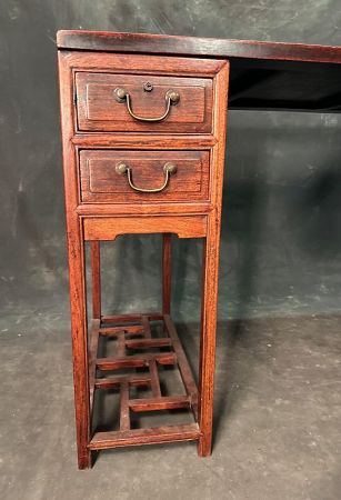 The tabletop displays a gently worn surface with a softly raised frame, bearing the patina of decades of use. Each side cabinet contains stacked drawers fitted with original brass pulls, while open latticework below provides both structural support and visual lightness. The restrained lines and balanced proportions reflect the aesthetic of the scholar’s studio, where furniture was meant to support study, calligraphy, and contemplation rather than dominate the space.