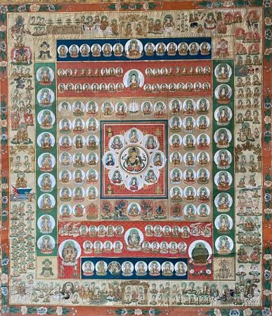 Japanese antique very large and intricate painted Garbhadhatu (Womb Realm) mandala scroll painting. This scroll has as it's center, the seated figure of Mahavairocana (the original Buddha) who is always nurturing all beings toward enlightenment. Used by esoteric practitioners as a tool with which to actualize their own enlightenment through ritual and meditative identification with the deities of the mandala. This mandala, along with the Diamond Realm mandala, were used as an important teaching device and ritual instrument in esoteric Buddhism, Shingon and Tendai traditions.