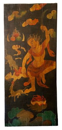 An antique Tibetan door once belonging to an offering cabinet or tantric torgam. The door is painted with a ferocious scene of a wrathful being holding a knife in one hand. In the background, a figure is being disemboweled by wild animals. Various other body parts and auspicious objects decorate the negative space. The painting combines tantric imagery with wrathful iconography and is meant to strike fear into hindrances while assuring divine protection to practitioners.