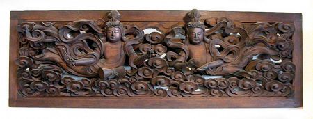 Incredible highly detailed hand carved Japanese temple ranma (transom carving). Carved of a solid thick slab of hinoki (Japanese cypress) wood. Depicting a pair of beautiful musical apsaras (celestial beings), floating in a elaborate swirling clouds. Each figure is adorned with a head dress and whimsical flowing dress. The celestial beings are shown holding a drum and the other a flute. The transom is carved in high relief with great detail. The sculptural and dimensional elements are unusual for this ranma’s example.