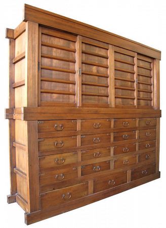 Beautiful Japanese antique 2-section merchant's chest, made of hinoki (Japanese cypress) wood, copper hardware including warabite shaped drawer pulls and corner bracing on each drawer, top section as 4 sliding panels with rounded horizontal slats which cover a large compartment with a single shelf (removable), the bottom section has four rows of four medium sized drawers under which is a single row of 3 larger drawers (total of 19 drawers), Meiji Period (1868-19120.